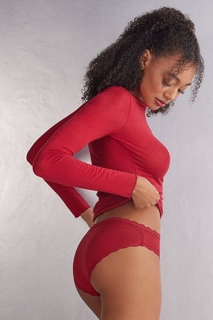 V-neck silk top with adjustable spaghetti straps embellished with lace details in the neckline and at the hem. Perfect as lingerie and under a jacket. The model is 179 cm tall and wears size S.